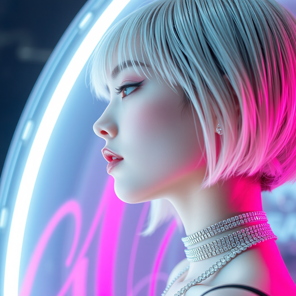 A cyberpunk-inspired image featuring a girl's face in side view, capturing a pretty and cute aesthetic. Her lips gleam against her white skin, highlighted by a silver shiny necklace. The backdrop is a sleek, metallic silver. The design is infused with graphic elements and electronic pink tones, set with a subtle futuristic vibe.