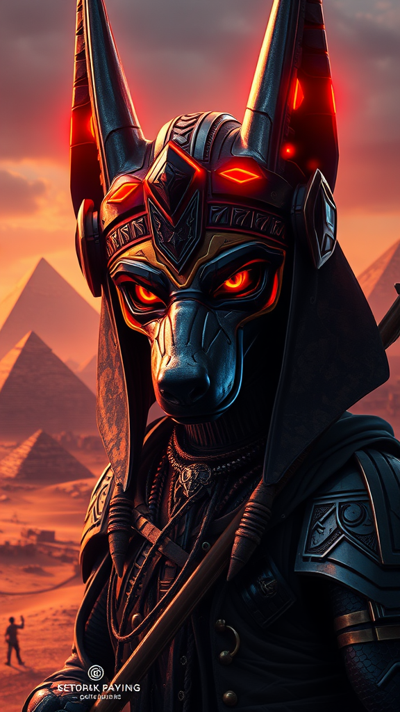 A cyberpunk-inspired portrait of Anubis, set against a backdrop of ancient pyramids, with an emphasis on hyperrealistic and intricately detailed features. The composition captures dynamic lighting and a dark fantasy atmosphere, blending elements of Egyptian mythology with futuristic themes. The focus is on Anubis' striking, hyperdetailed eyes that convey depth and mystery, framed by a headpiece that reflects the sheen of advanced technology. The setting is enhanced by the ethereal glow of neon lights, casting eerie shadows onto the surrounding desert sands. The detailed matte painting and hyperrealism evoke a sense of awe, drawing attention to the elaborate patterns on Anubis' armor and the intricate design of his staff. The artwork is rendered in a style reminiscent of Greg Rutkowski's masterful epic creations, embodying an otherworldly, eldritch vibe while maintaining aesthetic balance and clarity.