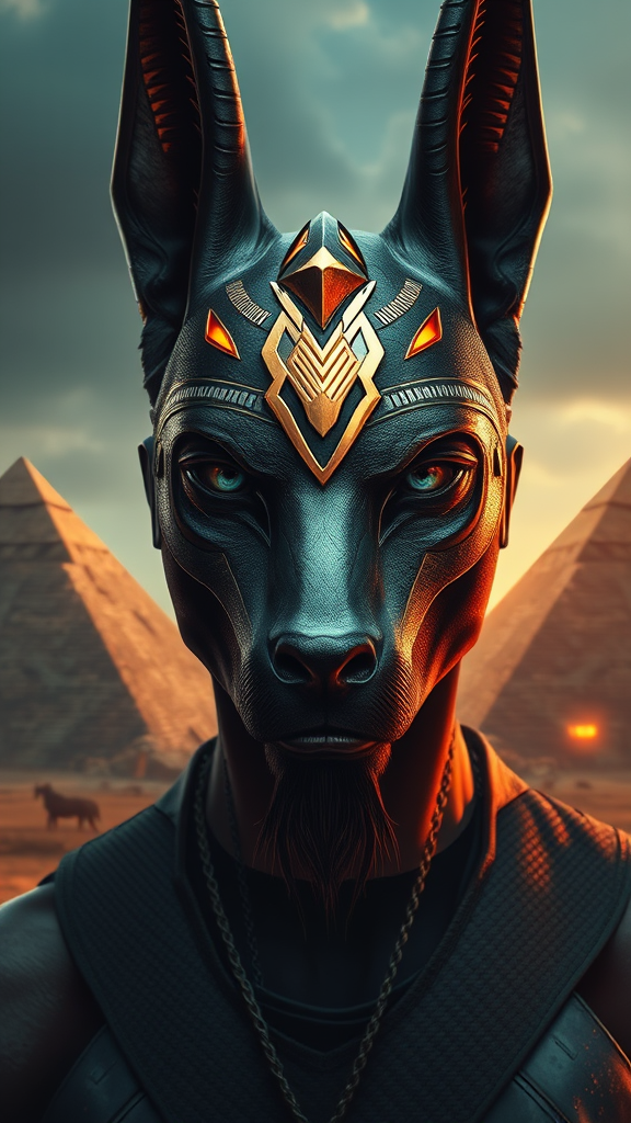 A cyberpunk-inspired portrait of the Egyptian god Anubis with a male figure, set against a futuristic backdrop of pyramids. The depiction features hyper-realistic, intricately detailed eyes and a face, emphasizing dark fantasy elements in a style reminiscent of Greg Rutkowski's epic masterworks. The scene is rendered in 8k resolution concept art, capturing dynamic lighting and a sense of eldritch mystery. Despite the potential for anatomical distortions, the artwork maintains a focus on realism and meticulous detail, avoiding poorly executed elements such as extra limbs, blurred images, or poorly drawn features. The composition is centered and clear, with a focus on high quality and masterful execution, ensuring a striking balance between the traditional and the futuristic.