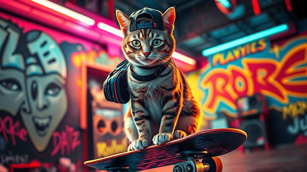A cyberpunk-inspired scene featuring a sleek cat perched confidently on a skateboard, adorned with a backwards baseball cap and clutching a flashy boombox on its shoulder, its expression radiating cool assurance. The setting is alive with vibrant neon colors and a graffiti-style backdrop full of edgy, urban flair. The mood is playfully rebellious, with intricate detailing that captures the striking ambiance. This high-quality artwork is crafted in a masterful composition, offering a wide-angle 8K resolution, enhanced by Octane rendering, with stunning ray-tracing effects and the vivid contrast of HDR10, showcasing a visually immersive experience.