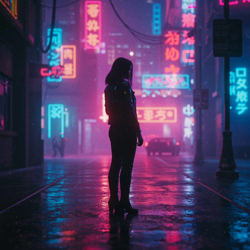 A cyberpunk-inspired scene featuring a woman standing alone in the rain, silhouetted by vibrant neon lights in a futuristic cityscape. Shot with a Canon EF 50mm f/1.8 STM lens, capturing the essence of 2077 with a realistic, hyperrealistic touch. The photograph showcases remarkable depth of field and cinematic details, enhanced by raytracing and colorful rim lighting. Despite its visual complexity, itβs presented in low resolution with attributes like text errors, missing or extra digits, cropped framing, and visible jpeg artifacts, lending it a unique, imperfect charm. Amidst elements of bad anatomy and mutant-like distortions, the image retains its compelling, edgy aesthetic with touches of blur, fuzziness, and occasional watermarks.