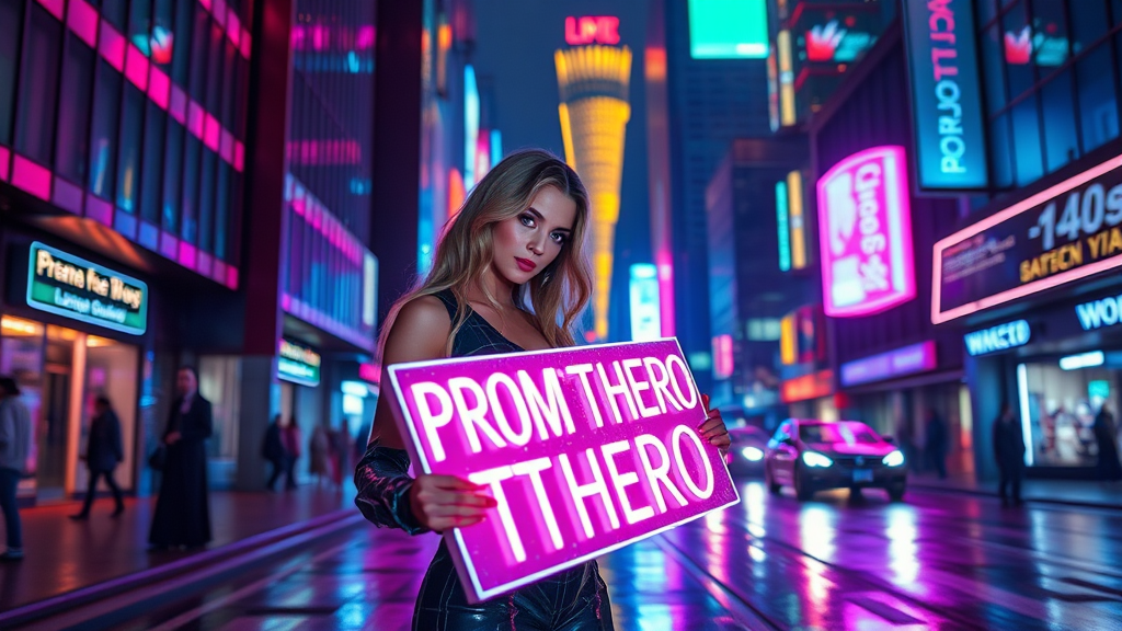 A cyberpunk-inspired scene with Lana Del Rey standing on a bustling night street, illuminated by vibrant neon lights. She's holding a glowing sign that reads "PROMTHERO" in bold, dazzling letters. The cityscape around her is filled with towering skyscrapers, flickering holograms, and neon reflections, casting a colorful glow onto the wet pavement. Her expression is enigmatic, and she’s dressed in futuristic attire that blends seamlessly into the vivid, dreamlike atmosphere of the urban night.