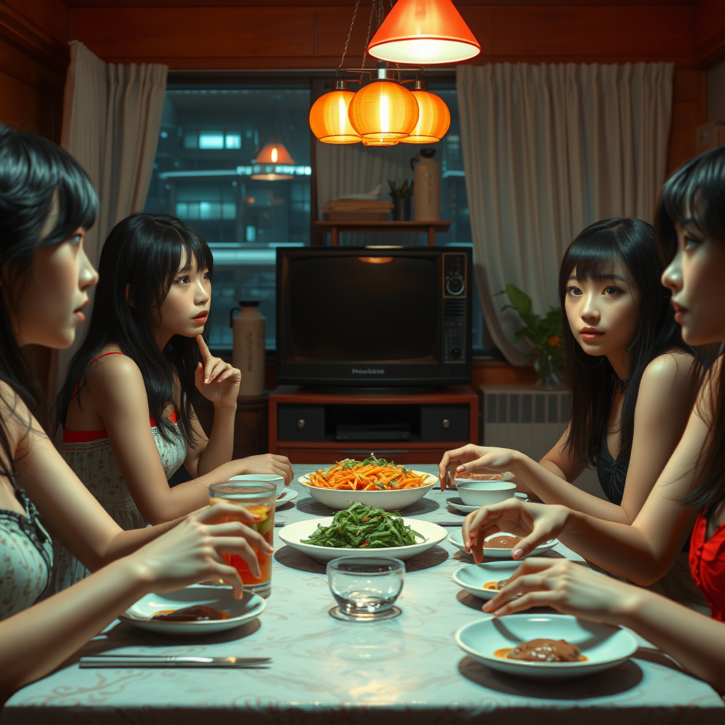 A cyberpunk Japanese home, featuring stunning girls gathered around a dinner table, with highly realistic facial features and hands. The scene captures a woman watching TV as part of a dinner gathering, all depicted with exceptional attention to detail and artistry. The image is vibrant, though avoiding oversaturation or any distortions, with high-resolution clarity. Every component, from facial expressions to body proportions, aligns perfectly to create a seamless, immersive experience.