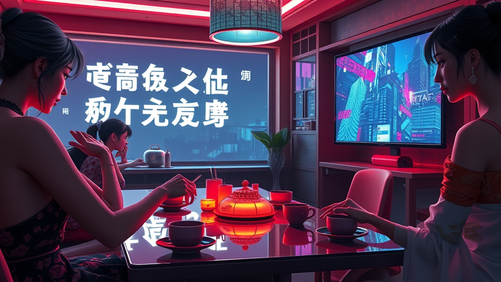 A cyberpunk Japanese home, sleek neon lights illuminating the room as elegant women gather around a dining table, their features highlighted by the glow. Realistic letters scrawl across a digital screen in the background, while their exquisitely detailed hands gracefully handle utensils and delicate tea cups. Nearby, a woman sits captivated by a holographic TV casting vibrant patterns across the walls. This scene is a masterpiece of futuristic design, blending traditional Japanese elements with advanced technology, capturing a moment of serene beauty amid the bustling cityscape outside.