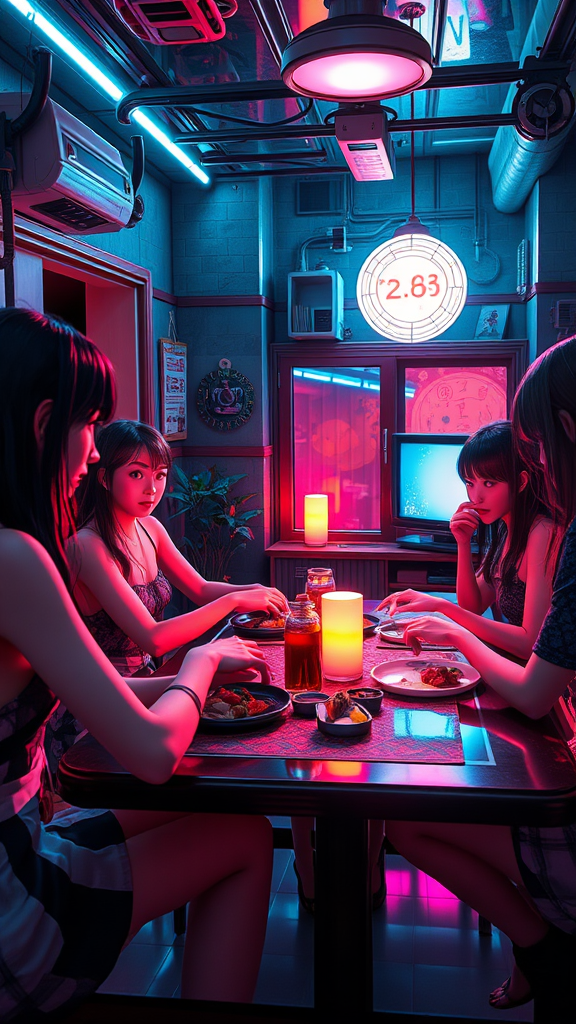 A cyberpunk Japanese house, beautiful girls gathered around a dinner table, realistic faces and hands, with one woman watching TV. The setting is a masterpiece composition, featuring intricate details and vibrant colors. The atmosphere exudes a futuristic aesthetic with neon lighting and sleek design while maintaining an intimate and serene ambiance. The scene captures a perfect blend of technology and tradition, showcasing realistic interactions and lifelike expressions.