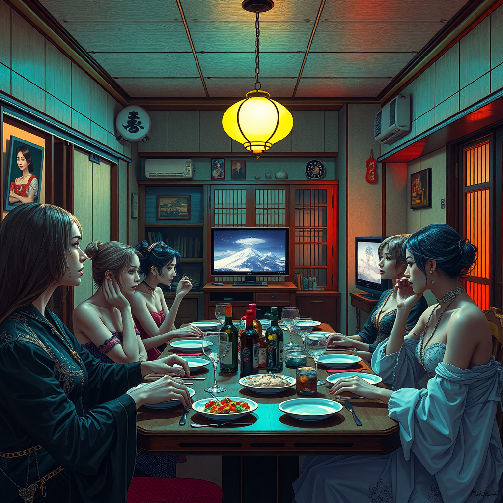 A cyberpunk Japanese house, elegant women gathered at the dinner table with realistic expressions and hands, a cozy setting with a woman watching TV, showcasing a masterpiece atmosphere. The scene is vibrant yet balanced, capturing the essence of a futuristic and culturally rich environment.