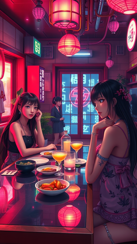 A cyberpunk Japanese house featuring beautiful girls with realistic faces and hands sitting at a dinner table, a woman watching TV, showcasing a masterpiece of vibrant and intricate design. The setting is filled with neon accents and high-tech elements, giving a sense of futuristic elegance and sophistication. The characters appear lifelike with natural expressions and attentive details, set against a backdrop that blends traditional Japanese aesthetics with cyberpunk flair. A warm, inviting atmosphere is created by subtle light contrasts and a harmonious arrangement, capturing a serene yet dynamic scene.