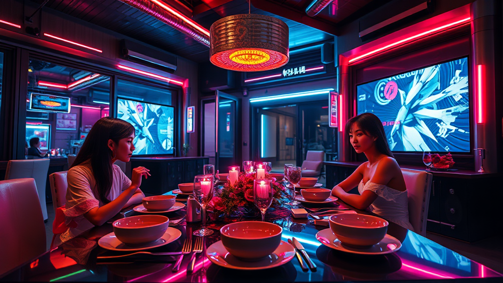 A cyberpunk Japanese house filled with futuristic architecture and neon lights. Beautiful women with realistic faces and perfectly formed hands sit gracefully at a meticulously set dinner table, exuding elegance and style. One woman glances at a sleek ultra-modern TV screen, her expression a mix of curiosity and intrigue. The setting captures the ambiance of a masterpiece, with vibrant colors reflecting off sleek surfaces, evoking future-meets-traditional aesthetics. The scene is rich in detail, presenting a harmonious blend of advanced technology and cultural elements within a captivating domestic setting.