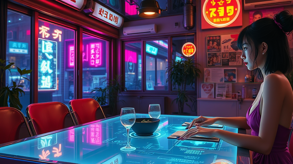 A cyberpunk Japanese house with beautiful girls sitting at a sleek dinner table, realistic faces and hands, immersed in a vibrant yet serene atmosphere. A woman glances at a holographic TV display, while the neon lights outside cast colorful reflections inside. The setting is an intricate masterpiece of futuristic urban culture, beautifully detailed and harmoniously composed.