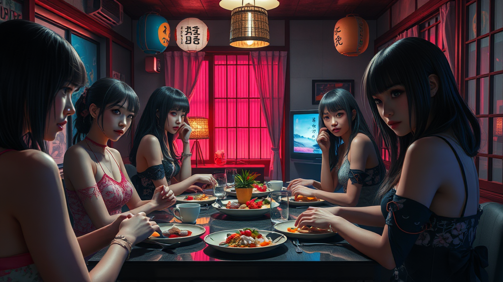 A cyberpunk Japanese house with enchanting girls gathered around a dinner table, showcasing realistic faces and perfectly rendered hands. The atmosphere is enhanced by a woman casually watching TV in the background, creating a masterpiece of intricate details and vibrant colors. The scene is vivid and immersive, featuring a futuristic yet traditional setting that is both eye-catching and meticulously crafted. The concept avoids any disfigured or over-exaggerated elements, focusing instead on a harmonious blend of technology and beauty.