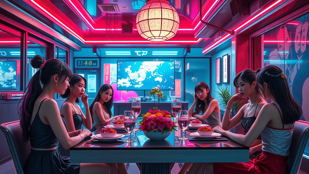 A cyberpunk Japanese house with sleek architecture, featuring beautiful women with realistic expressions seated around a modern dinner table, one casually watching a holographic TV screen in the background. The scene is vivid with intricate details, capturing the lively yet relaxed atmosphere of this futuristic setting. The interior combines traditional Japanese elements with advanced technology, adorned with vibrant neon lights that highlight the meticulous design. The dinner table is elegantly set, emphasizing the harmony between high-tech aesthetics and cultural authenticity. Each character's appearance showcases diversity and individuality, portraying a sense of unity in this high-tech world. The scene maintains clarity and sharp focus, ensuring realistic portrayals and keeping the essence of cyberpunk vibrancy without any distortion or abnormalities.