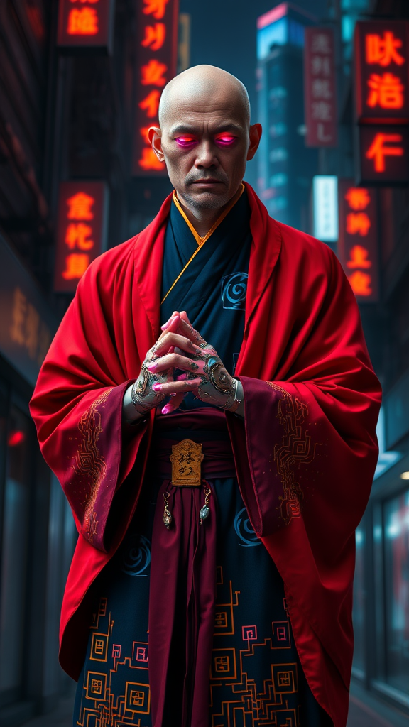 A cyberpunk monk in modern day China, with vibrant and detailed attire, blending traditional monastic robes with neon accents and circuitry patterns. The figure stands against a backdrop of dimly lit alleyways and towering skyscrapers, with a blend of warm and cool lighting creating an air of both mysticism and unease. He wears a bold, crimson-colored cloak with intricate, golden circuitry etched into the hem, complemented by a midnight blue cassock adorned with indigo-colored hieroglyphs that shimmer like digital displays. His hands are clasped in a classic meditative pose, though the fingers themselves are replaced by sleek, metallic prosthetics, adorned with subtle, pulsing LEDs that dance in time with the faint hum of underground electronics. His face is a breathtaking amalgam of Eastern features and cybernetic enhancements. Delicate, almost porcelain-like skin meets brassy, mechanized enhancements that transform his eyes into a kaleidoscope of shifting colors and vibrant light. Each iris burns with an inner fire, like small stars suspended within the darkness of his pupils. The artwork comes alive as this cyberpunk monk is set in a world of abject poverty, where pollution hangs as a choking shroud, and desperation festers like an open wound. Amid the backdrop of hopelessness, his figure stands as a defiant testament to the enduring allure of beauty and vibrancy.