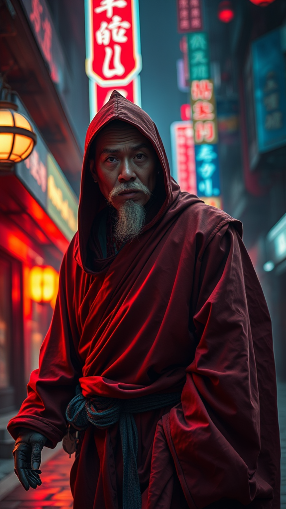 A cyberpunk monk navigating the neon-lit streets of futuristic China, showcasing a fascinating blend of traditional robes with advanced cybernetic enhancements, surrounded by an aura of mystery and wisdom. The scene is bathed in a gloomy yet captivating illumination, creating an atmosphere that feels both intense and otherworldly. The monk's eyes, incredibly detailed and expressive, hint at a deep understanding of the digital and spiritual realms. The setting is filled with vivid colors that pop against the dark backdrop, captured in stunning 16k UHD and HDR10 quality. The composition beautifully highlights the seamless fusion of ancient spirituality and cutting-edge technology, presenting a full-body view that emphasizes intricate details and a sense of serene power.
