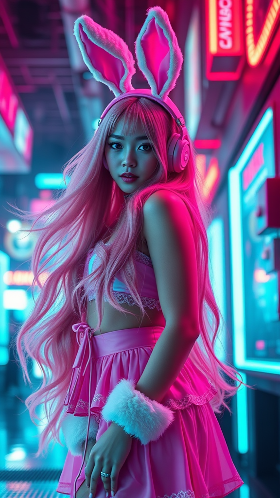 A cyberpunk pink Santa Claus girl in the digital realm, with stunning flowing hair, donning a pink skirt and vibrant pink bunny ears. Her look is completed with sleek pink headphones, surrounded by neon lights that evoke a futuristic tech atmosphere. Captured with a Phase One XT IQ4 150MP camera, the image has a low exposure and high contrast setting at ISO 50 using an 80mm prime lens, offering a striking and immersive depiction of this cyberpunk world.