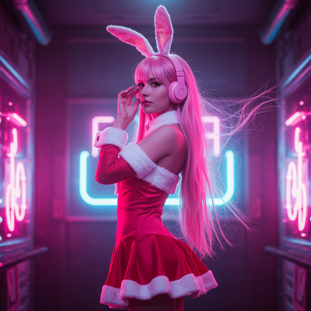 A cyberpunk pink Santa Claus girl with flowing long hair, donning a vibrant pink skirt and playful pink bunny ears. She wears sleek pink headphones, surrounded by the glow of neon lights that cast a futuristic aura. Her presence embodies a blend of technology and style. Captured with a Phase One XT IQ4 150MP, the image features low exposure and high contrast, shot at ISO 50 through an 80mm prime lens, highlighting the crisp details and vivid colors of a high-tech cyber world.