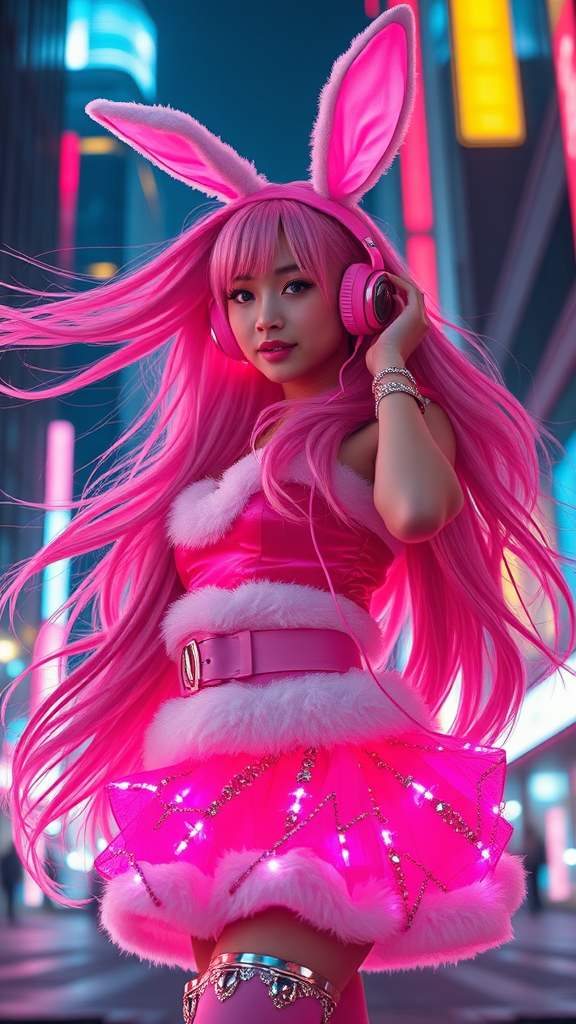 A cyberpunk pink Santa Claus girl with flowing, luminous hair, dressed in a vibrant pink skirt adorned with glowing patterns, and accessorized with matching pink bunny ears. She wears sleek pink headphones that blend seamlessly into the neon-lit backdrop of a futuristic cityscape. Her electric presence exudes a sense of a technological future. Capture her essence with a Phase One XT IQ4 150MP camera, emphasizing low exposure and high contrast at ISO 50 with an 80mm prime lens, drawing out the dynamic interplay of light and shadow.