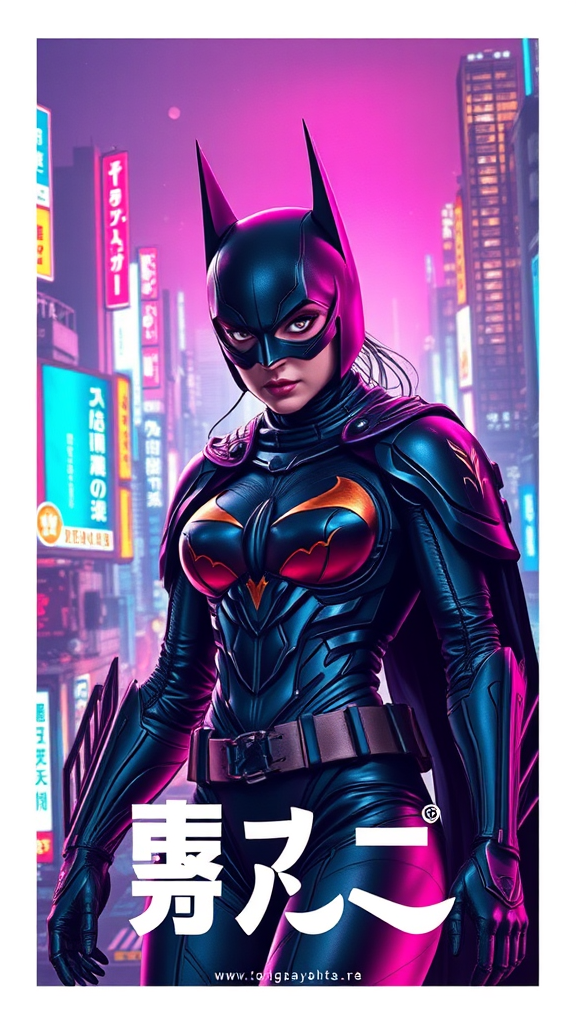 A cyberpunk poster featuring Batgirl in a futuristic Tokyo, showcasing deconstructivist elements and a darksynth aesthetic, inspired by Maciej Kuciara. The vibrant cityscape is bathed in neon hues with a dystopian atmosphere, reflecting intricate details typical of cgsociety and behance hd styles. The composition includes a large white border and Japanese typography overlay, adding a cultural and modern twist to the scene.