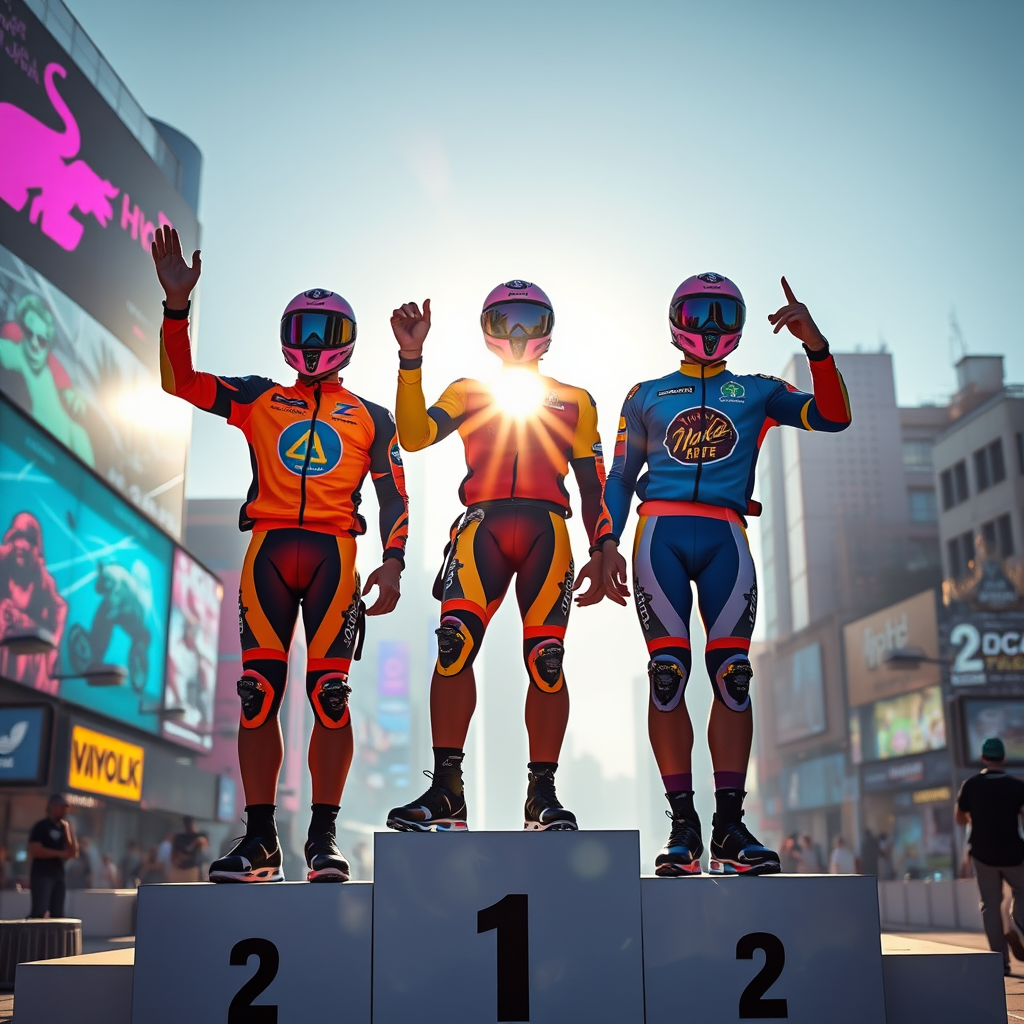 A cyberpunk summer scene unfolds with three riders standing triumphantly on a podium, their vibrant, neon-infused attire emblazoned with logos of various futuristic clubs. The podium is bathed in an intense, warm glow from the sun, casting long shadows and illuminating their faces with a soft, golden light. The camera captures the moment from a slightly elevated, front-facing vantage point, showcasing the intricate details of their clothes and the sleek, metallic elements intertwined with their gear. The backdrop is a fusion of urban skylines and digital billboards, pulsating with electric colors, enhancing the futuristic ambiance of the scene.