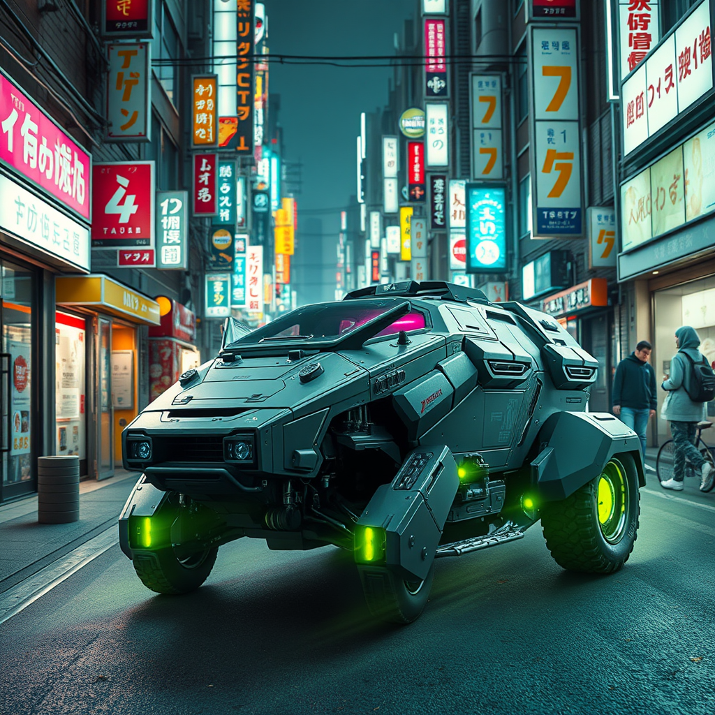 A cyberpunk-themed futuristic armored vehicle navigating through the narrow alleys of a neon-lit Japanese metropolis, its sleek design brimming with advanced technology and emitting a gentle hum amidst the vibrant urban landscape.
