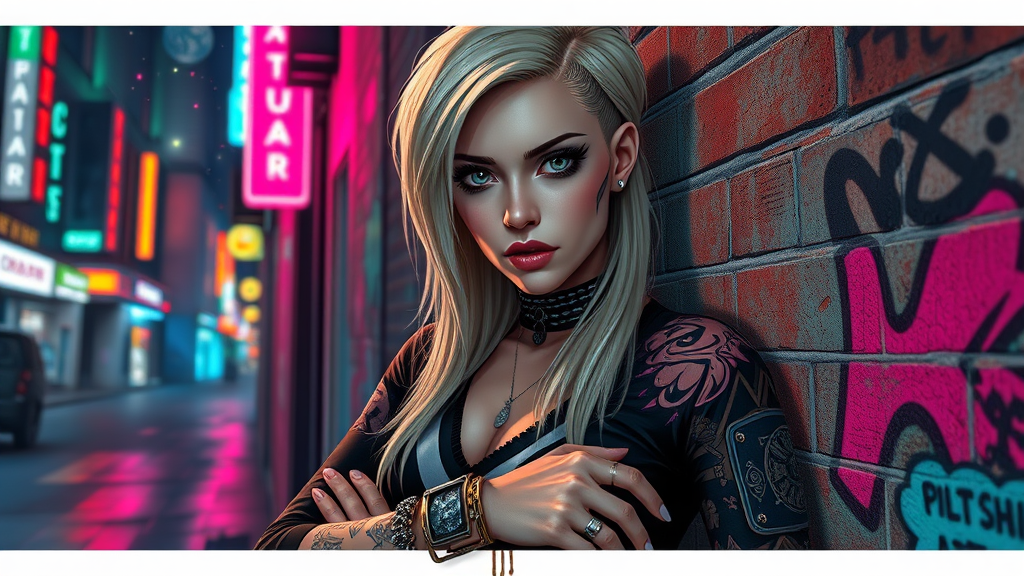 A cyberpunk woman stands confidently against a gritty wall on a neon-lit street of a futuristic city. The vibrant city lights and the glow from the stars and moon create a colorful backdrop. Her piercing reflective eyes, lined with dramatic makeup, and a scowl complement her intricate face tattoos. The woman’s long blonde hair cascades down her shoulders contrasting with the punk-edge of her short hair, exaggerated by her many ear piercings and rings. Dressed in long sleeves and numerous bracelets, she embodies the essence of an alt-girl style. The chiaroscuro effect accentuates her form against the brick wall adorned with artistic graffiti. The scene is captured in a blend of professional majestic impressionism akin to the works of artists like Waterhouse, Constable, and Mann, yet infused with a dynamic, anime-like vibrance reminiscent of Studio Ghibli and Makoto Shinkai. This intricate portrait is a canvas of high detail, showing a perfect composition within its frame, trending robustly on platforms like ArtStation and CGSociety, offering a beautifully dramatic representation without any distortion or unrealistic proportions.