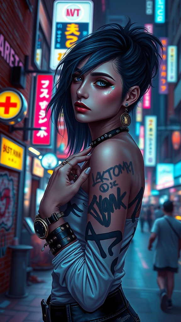 A cyberpunk woman stands on a bustling city street at night, bathed in a symphony of colorful city lights. Her detailed, symmetrical face is adorned with reflective eyes and striking makeup, framed by long, flowing hair and unique ear piercings. This punk girl embodies an alt aesthetic, with multiple rings on her fingers and bracelets that catch the dramatic rim lighting. She wears long sleeves and stands in front of a brick wall, embellished with vibrant graffiti. The scene evokes a majestic impressionism style reminiscent of masters like Waterhouse and John Constable, with a modern twist inspired by artists such as Ed Blinkey, Atey Ghailan, and Studio Ghibli. The artwork is intricate and high in detail, blending dramatic chiaroscuro lighting and the ethereal essence of Makoto Shinkai’s Kyoto visions, making it a captivating piece trending on platforms like ArtStation and CGSociety.