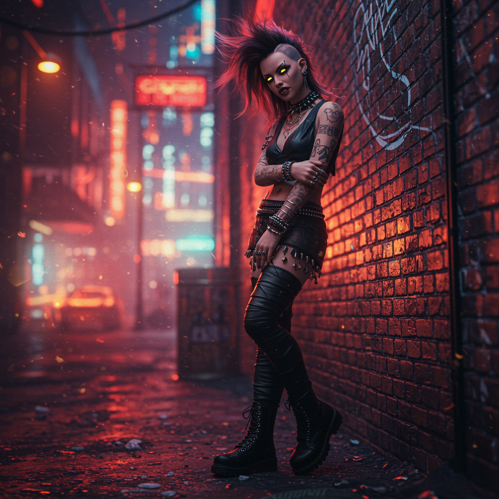 A cyberpunk woman with an edgy yet striking appearance stands confidently against a brick wall in a bustling cyberpunk city street at night. The city lights cast colorful reflections on her intricate features, and a vibrant chiaroscuro effect highlights her dynamic pose. Her long hair flows dramatically, contrasting with elements of her punk style and numerous rings and ear piercings. She wears makeup that accentuates her reflective eyes and scowling expression, conveying both strength and mystery. Her attire includes long sleeves and bracelets, blending seamlessly with the urban backdrop of graffiti-decorated walls. Detailed, dramatic lighting enhances the scene, drawing inspiration from impressionism and modern digital art. Her muddy boots and black shoelaces ground her in the gritty environment, all captured in a majestic and intricate artistic style that evokes the works of classical and contemporary masters, trending on platforms like ArtStation and CGSociety, creating a vivid and engaging portrait of a cyberpunk heroine.