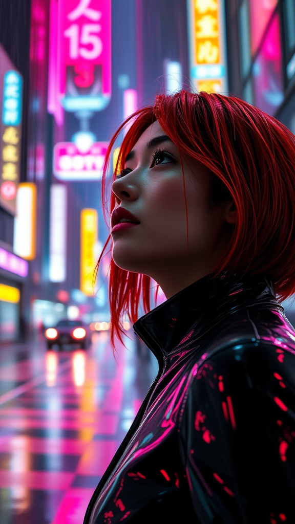 A cyberpunk woman with striking red hair gazes upward in a rain-soaked night, clad in a sleek black suit that gleams under the vivid neon lights. The city pulsates with vibrant hues reflecting off the slick surfaces, captured in stunning detail through octane rendering. Her surroundings are realistic, painted with intricate ray tracing that highlights the futuristic architecture of this cyberpunk city. The scene is captured up close, immersing you in an 8k landscape that feels both intimate and expansive, set against an aspect ratio of 9:20, where the dynamic interplay of light and shadow adds to the ambiance of a world that is both familiar and otherworldly.