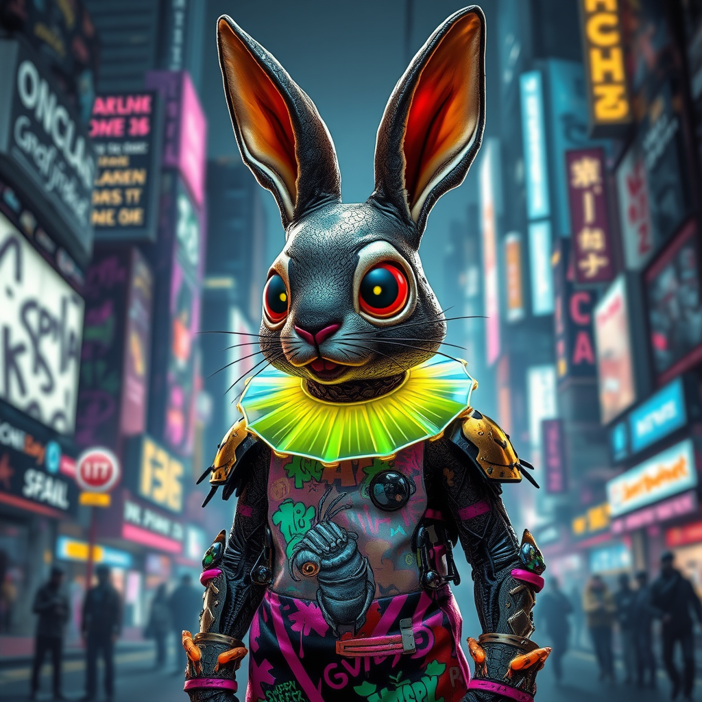A cyberpunk zombie bunny adorned with an iridescent collar, blending playful darkness and vibrant hues, stands amidst a futuristic cityscape. Its form is an intriguing assembly of swarming insects, creating a buzzing, living texture. The bunny’s attire is a kaleidoscope of colorful, graffiti-esque patterns, merging honeycore aesthetics with neon-lit, kid-like exuberance. It embodies a striking fusion of the whimsical and the eerie, set against a backdrop of dazzling urban lights and abstracted street art.