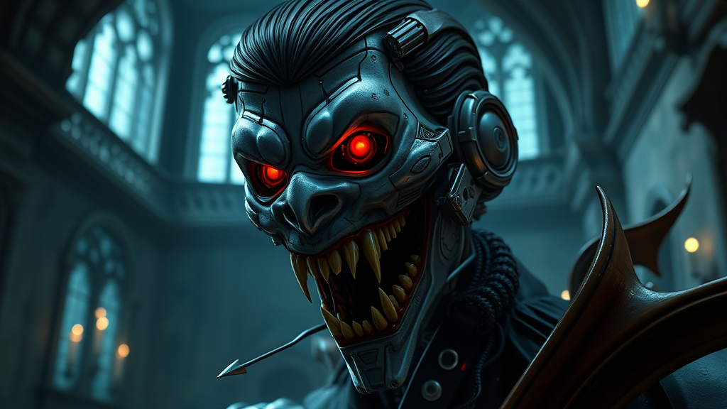 A cyborg vampire with complex robotic features and piercing red eyes exudes a menacing aura. Its sharp fangs bared within an open mouth, the creature has slicked back short black hair, set against the backdrop of a shadowy castle interior. The scene, rendered in Unreal Engine 4, showcases cinematic lighting that highlights the intricate blend of organic and mechanical elements within its design.
