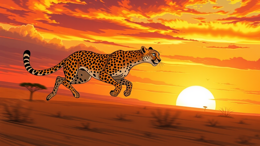 A daring cheetah races across the open savannah, its slender form a blur of power and agility. Inspired by Pixar Animation Studios and Art Spiegelman, the energetic illustration captures the essence of motion, set against a breathtaking sunset sky that paints the horizon in vibrant hues, adding drama and depth to the scene.