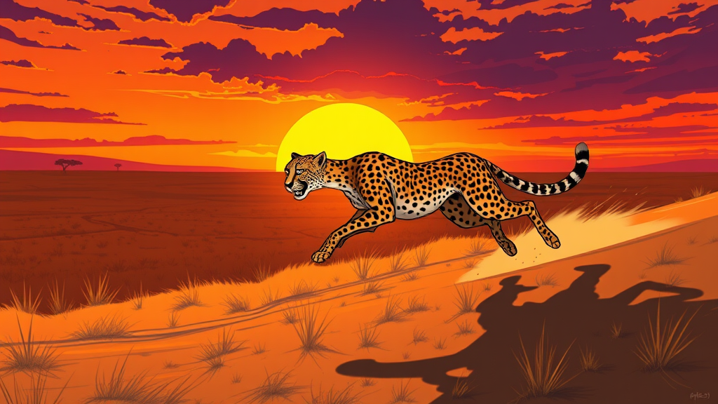 A daring cheetah races across the sprawling savannah, its elegant form and incredible velocity captured in a vivid scene. Inspired by the imaginative touch of Pixar Animation Studios and the bold style of Art Spiegelman, this dynamic illustration features the cheetah against a dramatic sunset, casting deep, elongated shadows over the landscape. The sky blazes with hues of orange and purple, highlighting the cheetah's fearlessness and grace as it becomes one with the wild horizon.