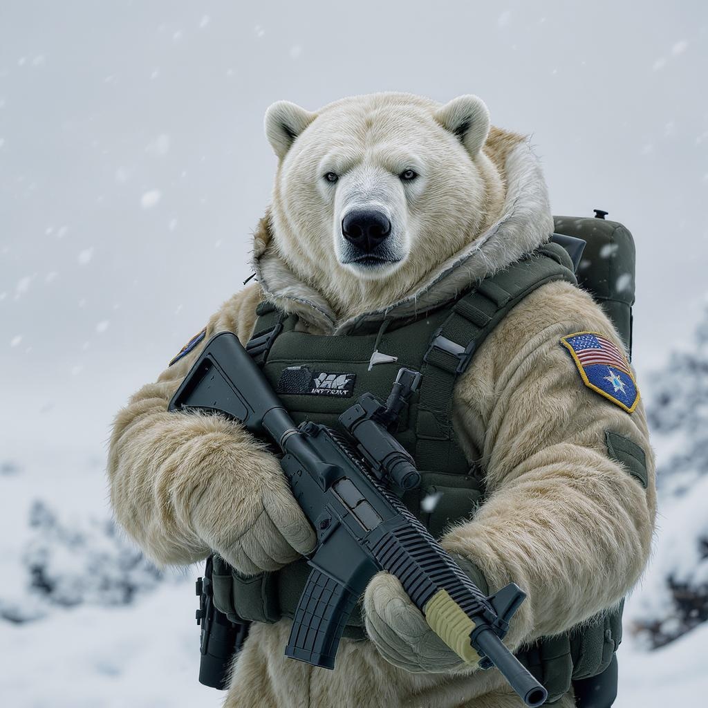 A daring polar bear dressed in a detailed winter military uniform, gripping a carbine rifle, portrayed as an anthropomorphic figure with super intricate details in ultra HD, resembling real life. The expression is full of character with maximum facial detail, enhanced by dramatic cinematic lighting, capturing a heroic essence in a towering 9:16 aspect ratio, emphasizing the impressive stature. The scene is set against a stark, snowy landscape, suggesting both strength and resilience amidst the elements, while adding a subtle touch of artistic flair to highlight the noble presence of this formidable creature.