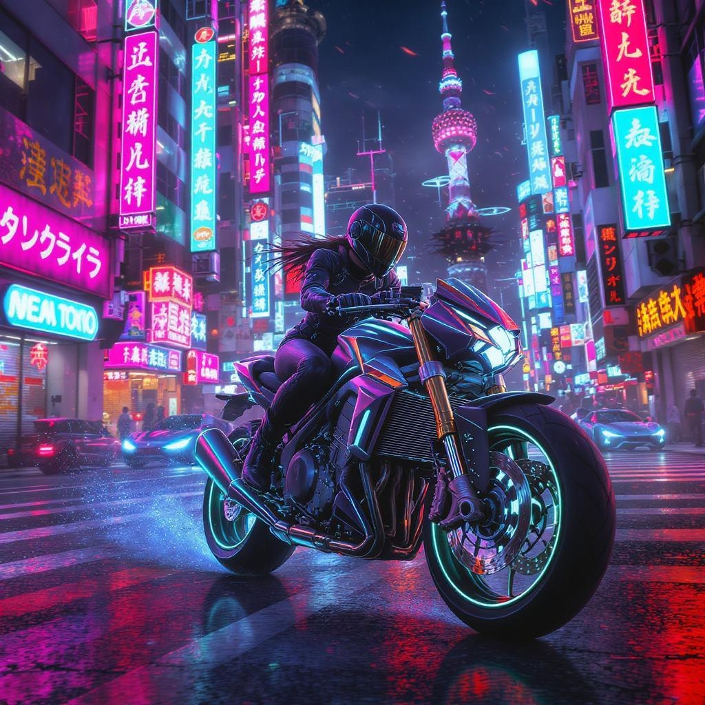 A daring woman, helmet-clad, navigates her sleek motorcycle through the bustling streets of NeoTokyo, reminiscent of iconic 80s anime. The cityscape glows with neon lights, casting vibrant reflections across her polished ride. Skyscrapers tower above, their retrofuturistic designs blending seamlessly with the urban sprawl. The roar of engines and whir of passing hover cars fill the air as she weaves through narrow alleys and broad avenues, embodying the spirit of rebellion and adventure in a high-octane homage to classic anime aesthetics.
