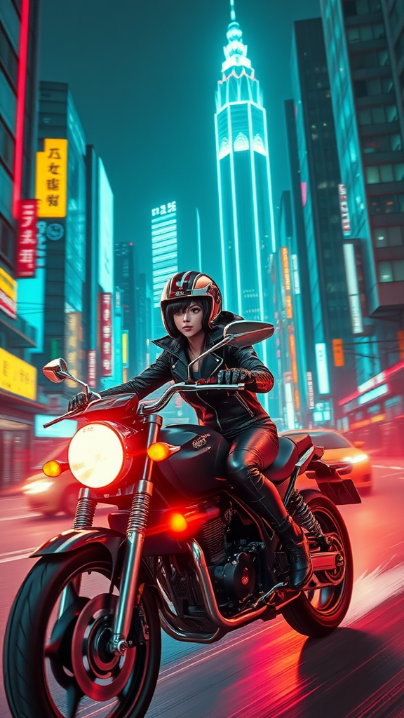 A daring woman navigates her motorcycle through the neon-lit streets of NeoTokyo, her sleek helmet reflecting the vibrant, pulsating glow of towering skyscrapers. The scene is straight out of an 80's anime, embodying a retrofuturistic vibe with synthwave hues and dynamic motion lines accentuating her speedy journey. Her leather jacket flutters in the wake of her ride, reminiscent of iconic anime heroes, as the electric hum of her bike blends with the city's futuristic symphony, capturing the essence of untamed freedom in a high-tech urban jungle.