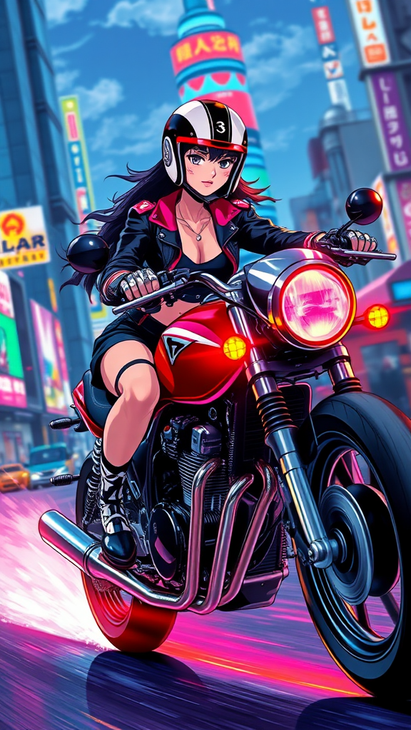 A daring woman with a sleek helmet rides her powerful motorcycle through the vibrant streets of Neo-Tokyo, her figure embodying the spirit of 80's anime style and retrofuturism. Neon lights reflect off the shiny metal of her bike, casting colorful streaks as she speeds through the bustling cityscape. The futuristic skyline, adorned with glowing skyscrapers and holographic advertisements, serves as a dynamic backdrop reminiscent of the Akira universe. Her outfit, infused with retro-chic details, flutters in the wind, enhancing her adventurous and fearless aura in this animated, cyberpunk world.