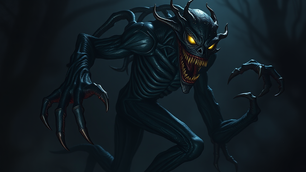 A dark and twisted creature emerges from the shadows, its form a grotesque amalgamation of human and beast, with elongated limbs and sharp, talon-like fingers. Its eyes glow with an eerie light, reflecting hunger and malice as it prowls through the night. This nightmarish entity is known as the Lifestealer, a sinister being that drains vitality from its prey to sustain itself. It moves silently, leaving behind only hushed whispers and chills down the spine. Its tattered, leathery skin stretches over a gaunt frame, barely concealing the powerful muscles beneath. The Lifestealer is both an enigma and a terror, an ancient force of darkness driven by an insatiable thirst for life.