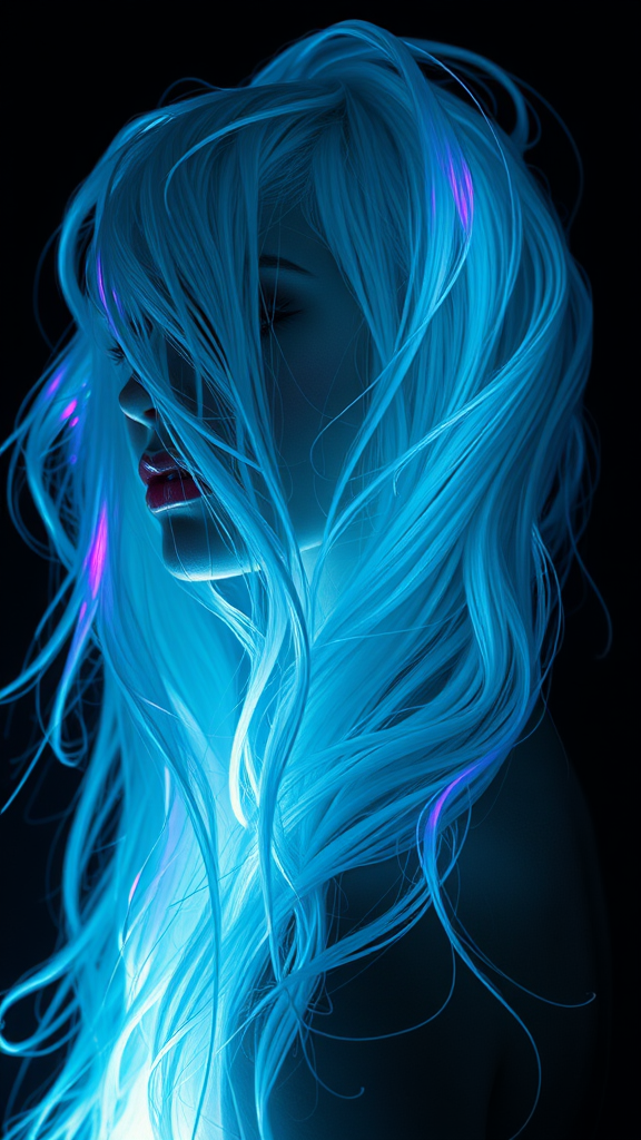 A dark backdrop featuring a woman with iridescent hair, rendered in a style reminiscent of trippy photography and fluid expressionism, with distorted forms and intricate facial features. The scene blends dark white and light cyan hues, infused with ghostcore aesthetics and glowing pastel tones.
