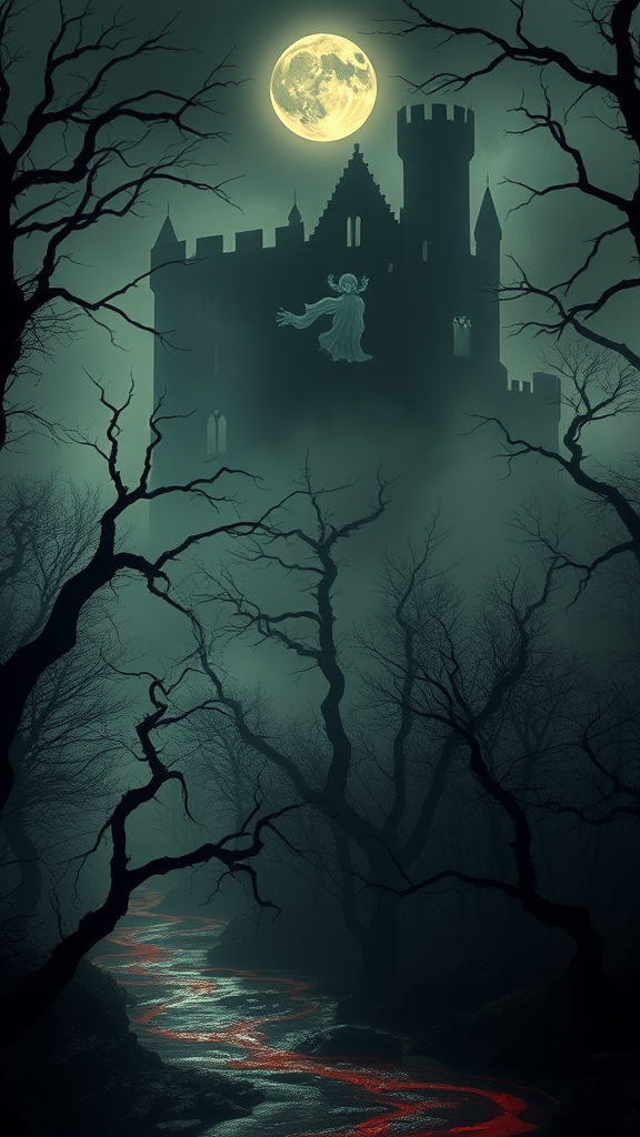 A dark, eerie forest shrouded in mist with twisted, gnarled trees that resemble clawed hands reaching skywards, their branches almost merging with the silhouette of an ancient, crumbling castle whose jagged, shadowy towers loom above. Moonlight attempts to pierce through the dense fog, casting a ghostly glow and illuminating the subtle movement of spectral figures that seem to meld into the landscape. A blood-red river snakes its way through the scene, adding a sense of foreboding as it glistens ominously under the pale light.
