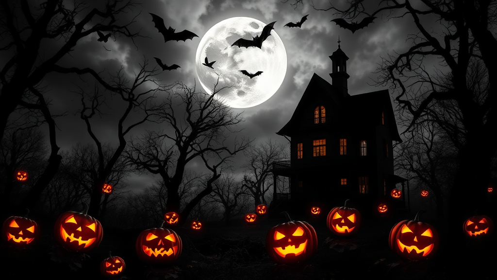 A dark, eerie haunted house looms in a black and white landscape, deep in a shadowy forest. Vibrant, glowing jack-o-lanterns light up the scene with an ethereal orange glow, casting flickering shadows on the twisted trees. Bats swoop through the air, silhouetted against a stormy sky. The full moon, visible through breaks in the storm clouds, bathes the scene in an otherworldly light, accentuating the mystique of this supernatural setting. A chill wind rustles the leaves, adding to the ominous atmosphere.