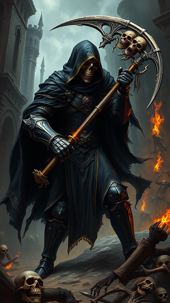 A dark fantasy painting depicting the grim reaper clad in full plate armor, engaging in battle. He wields a colossal scythe forged from bones and adorned with skulls, exuding an aura of dread. The scene is set within an ancient city of ominous design, littered with bones and animated skeletons rising from the shadows. The reaper's black hooded cloak with intricate gold trim billows around him, enhancing his formidable presence. A sinister skull mask conceals his face, adding to the enigmatic terror he embodies. The atmosphere is gritty and foreboding, filled with the echoes of clashing blades and the eerie glow of spectral flames illuminating the dark alleyways of this forsaken city, enriching the menacing ambience.