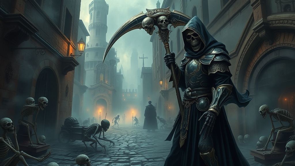 A dark fantasy painting depicts the Grim Reaper clad in elaborate full plate armor, brandishing an enormous scythe crafted from interwoven bones and skulls. The scene unfolds within a shadowy, ancient city, its eerie streets littered with bones and animated skeletons clattering about. The Reaper, shrouded in a black hooded cloak adorned with intricate gold trim, and an ornate skull mask, exudes a menacing presence. The backdrop reveals crumbling, gothic architecture, enshrouded with thick, ominous fog that coils through narrow alleyways and over cobblestone paths. Shadows dance with chaotic energy, lending an air of foreboding to this grim tableau.