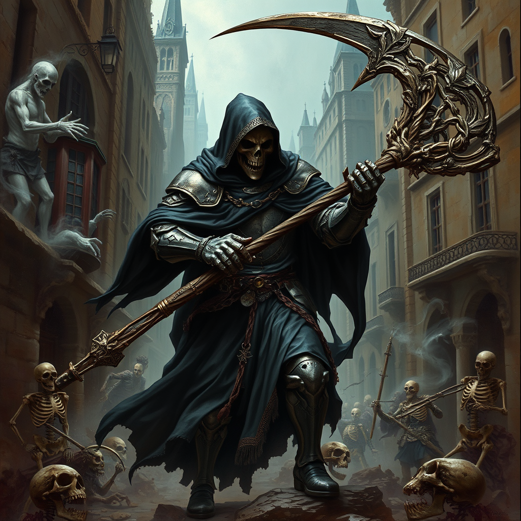 A dark fantasy painting depicts the grim reaper clad in intricate full plate armor, wielding an enormous, ominous scythe crafted from interwoven bones and skulls. He is engaged in a fierce battle amidst an ancient, shadowy city, its narrow streets and towering structures brimming with the eerie presence of skeletal remains. The reaper's black hooded cloak, adorned with ornate gold trim, billows menacingly as he moves, while a sinister skull mask conceals his visage. The chaotic atmosphere is amplified by swirling mists and ghostly apparitions, lending an unsettling charm to the grim setting.