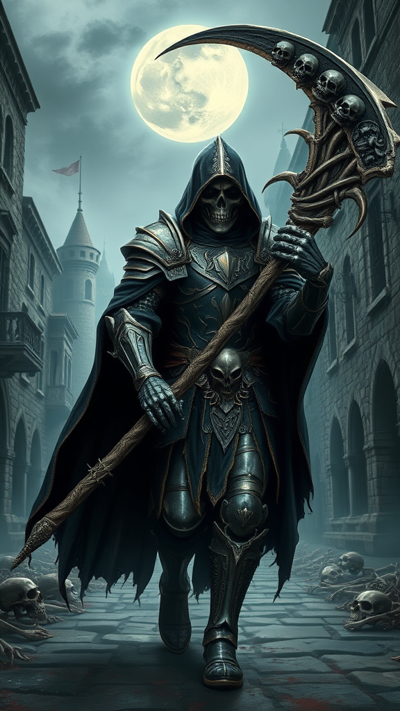 A dark fantasy scene depicting the grim reaper as a formidable warrior, clad in intricately detailed full plate armor that gleams ominously under a moonlit sky. The reaper wields a massive scythe forged of twisted bones and grinning skulls, its blade scarred and weathered from countless battles. The setting is an ancient, foreboding city, its shadowy streets littered with the remnants of long-lost souls, skeletal figures intertwined with the cobblestones. The reaper's black hooded cloak, lined with intricate gold trim, billows behind him, adding to his fearsome presence. His face is obscured by a menacing skull mask, eyes glowing with an eerie light, as he strides with purpose through the deserted city. The atmosphere crackles with grim determination and the whispers of the past, creating an environment that is both haunting and visually captivating.