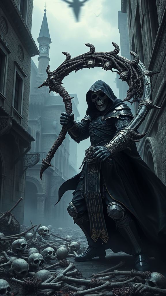 A dark fantasy scene depicting the Grim Reaper clad in intricate full plate armor, battling fiercely with an oversized scythe crafted from twisted bones and skulls. The backdrop is an ancient, shadowy city, its streets littered with ominous skeletal remains. The Reaper is adorned with a flowing black hooded cloak, detailed with elaborate gold trim, and wears an imposing skull mask. The atmosphere is thick with the aura of eerie mystery and gritty tension, as the battle unfolds under a dim, haunting sky. Fleeting shadows dance across the weathered stone buildings, enhancing the foreboding mood.