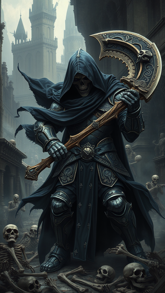 A dark fantasy scene depicting the grim reaper clad in intricate full plate armor, engaged in fierce combat. He wields an oversized scythe crafted from bones and skulls, each swing creating a sweeping arc of dread. The setting is a shadowy, ancient city overrun with the remains of past battles, where bones and skeletal figures litter the streets like eerie sentinels of forgotten eras. The reaper is draped in a flowing black hooded cloak adorned with ornate gold trim, and his visage is hidden behind a menacing skull mask, exuding an aura of inevitable doom. The atmosphere is gritty and intense, steeped in a sense of macabre fantasy, where every corner of the city whispers tales of its dark history and the finality of the reaper's relentless quest.