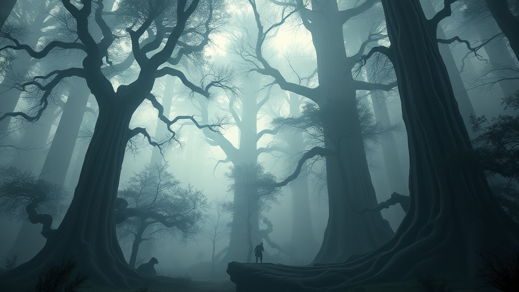 A dark fantasy scene with intricate details, illuminated by realistic and volumetric lighting, captures a mystical forest shrouded in ethereal mist, where ancient towering trees and mythical creatures reside. The environment is rendered in Full HD and 8K, showcasing the depth and textures reminiscent of high-quality concept art and rendered in Unreal Engine. This scene, trending on Artstation, evokes a hauntingly beautiful atmosphere, with hidden secrets and whispers of forgotten lore, ensuring that every shadow and glimmer is a part of a vivid, otherworldly narrative.