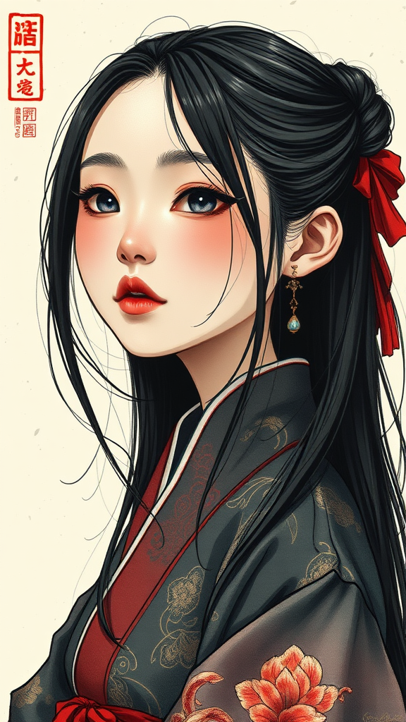 A dark-haired girl clothed in a fusion of traditional Asian attire, rendered with the precision of subtle ink techniques, embodying the essence of an appropriation artist. Her style echoes gothcore aesthetics, merging with the digital craftsmanship of ZBrush, creating an intricate character caricature. The portraiture is layered with hidden meanings, brought to life through painted illustrations that tell a deeper story, set against an elongated vertical aspect ratio of expressive detail.
