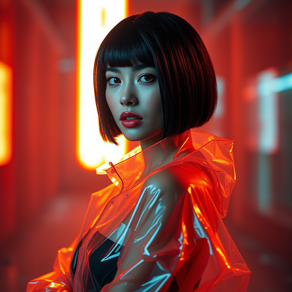 A dark-haired woman poses confidently in front of a warm, glowing orange light, her glossy transparent plastic futuristic raincoat catching the luminescent hues. Her sleek, short hair enhances an air of modern elegance, while the scene is bathed in volumetric lighting that adds depth and intrigue. Captured from a cinematic angle, the image radiates glamour and vibrancy, with subtle reflections playing across the smooth surfaces around her, creating an immersive and dynamic visual experience.