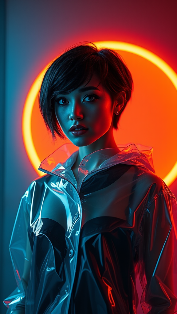 A dark-haired woman stands before a vivid orange glow, enveloped in a sleek transparent futuristic raincoat. Her short hair catches the volumetric lighting, creating a striking cinematic angle that highlights her features. The scene is imbued with a sense of glamour, with vibrant reflections dancing off the glossy material of her attire, adding an otherworldly allure to her presence.