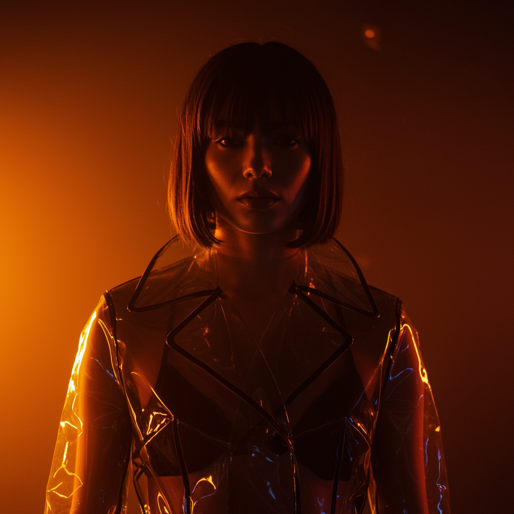A dark-haired woman stands confidently in the glow of a warm, amber light, her glossy transparent futuristic raincoat catching the hues. Her short hair frames her face in sleek layers, adding an edgy contrast to the vibrant scene. The volumetric lighting enhances the cinematic angle, casting dynamic shadows that accentuate her glamorous presence. Subtle reflections ripple across the raincoat's surface, blending the futuristic with the dramatic allure of the moment.